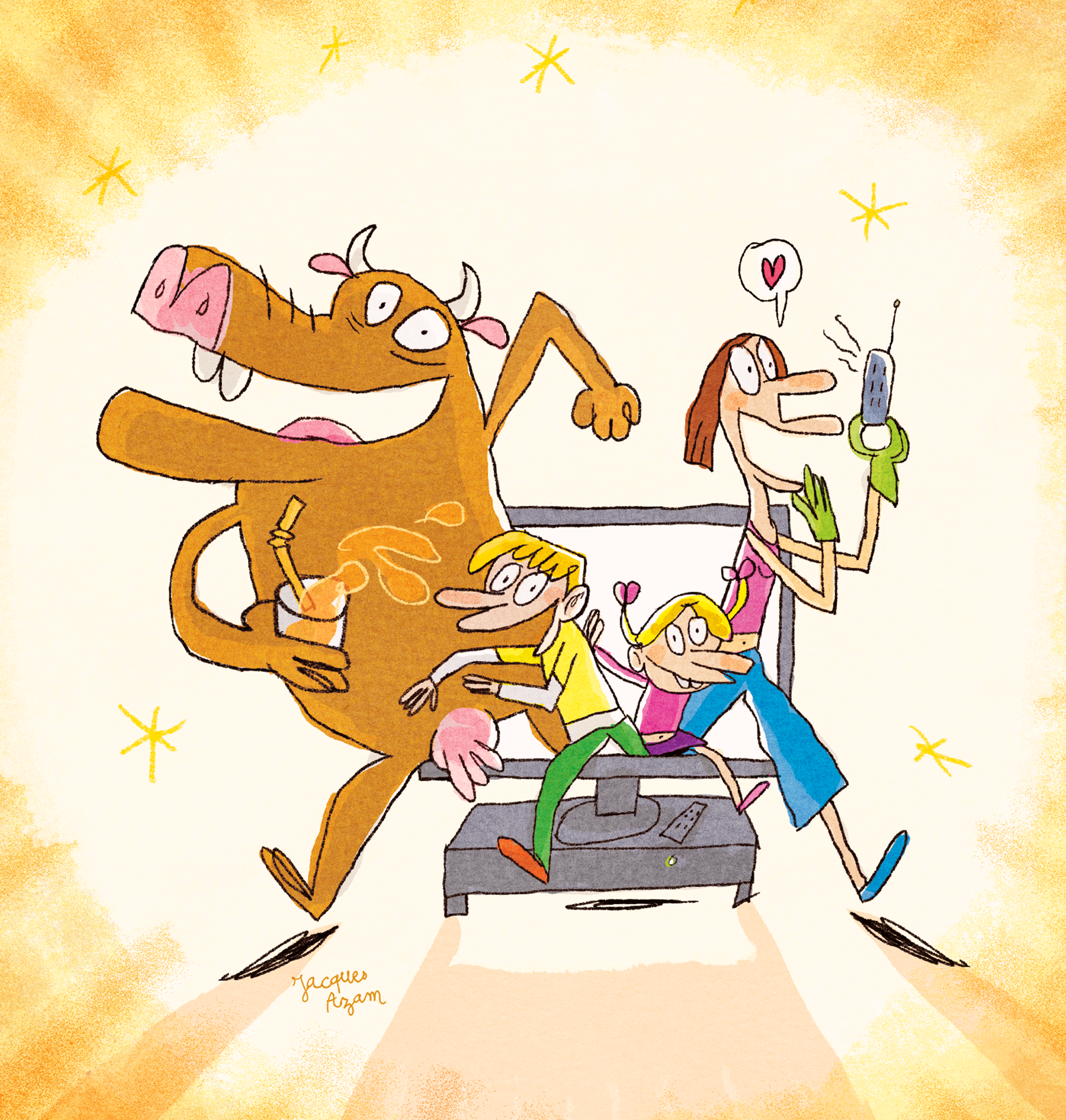 Jouez le mélange des saveurs: une maman inventrice au foyer qui ne rêve que du Nobel, un papa téléphone pleinement absent mais toujours à l’écoute, un Chico préado-peinardo-ramollo, une Lulu tyrannique gamine survitaminée et… La Vache !